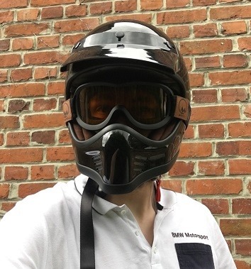 Surmonté de sa casquette et de son masque équipé soit d’une visière solaire ou transparente donne un look d’enfer !