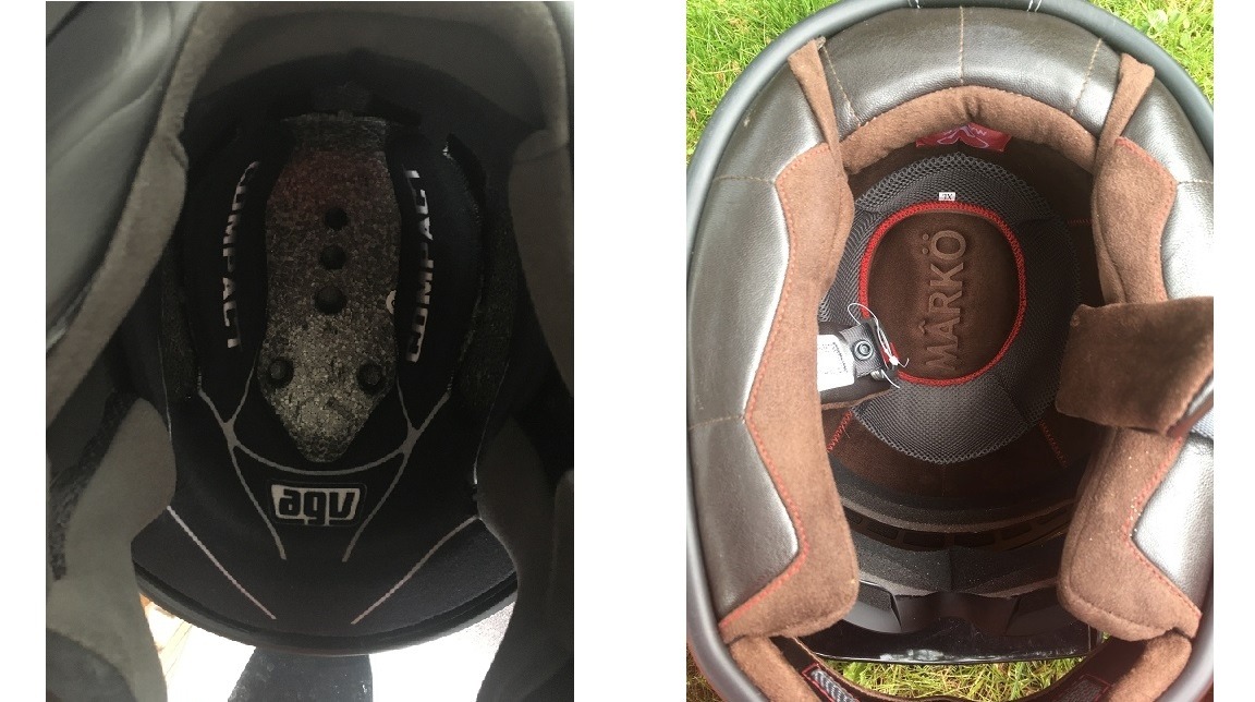 Le casque AGV est bien en dessous, avec sa faible épaisseur de mousse, son manque de confort et ses finitions bâclées qui laissent apparaître du polystyrène noir déjà abîmé. Il suffit de comparer les deux photos pour s’en rendre compte ! Je ne suis pas bon commercial mais je vous laisse constater qu’entre les deux casques c’est le jour et la nuit…